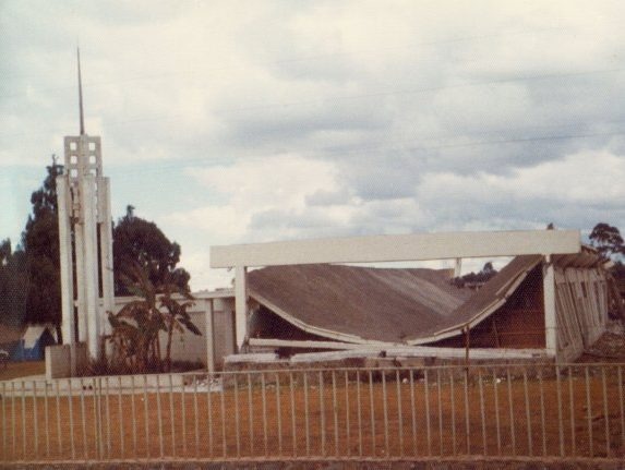 Parte trasera de la iglesia en Patzicía, Guatemala después del terremoto de 1976 (Foto cortesía de Michael Morris)